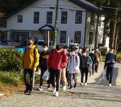 各ペンションから次々に集合場所に到着し、オーナー様と記念写真。いよいよこれから選択体験のスタートです。