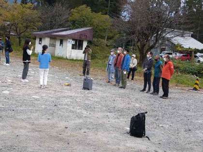 退村式の様子です。お世話になったペンションのオーナーと,名残を惜しみながらお別れです。