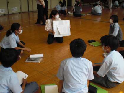 嵯峨美術大学の学生7名にも参加していただき、小グループの構成で、一人ひとりの作品について、制作した自分の考えや、仲間の感想(感じ方や考え方)を交流し、色や形の工夫や印象など、お互いの考えを深めることができました。美術大学生のみなさんの考えや視点も、とても参考になったようでした。