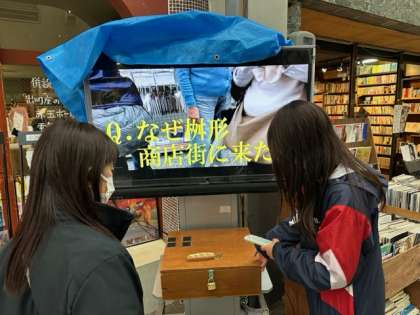 また、美術での取組と並行して、総合的な学習の時間では、桝形商店街をアピールするCM作成を行いました。そのCMを商店街の街頭で毎日上映させていただくことになりました。