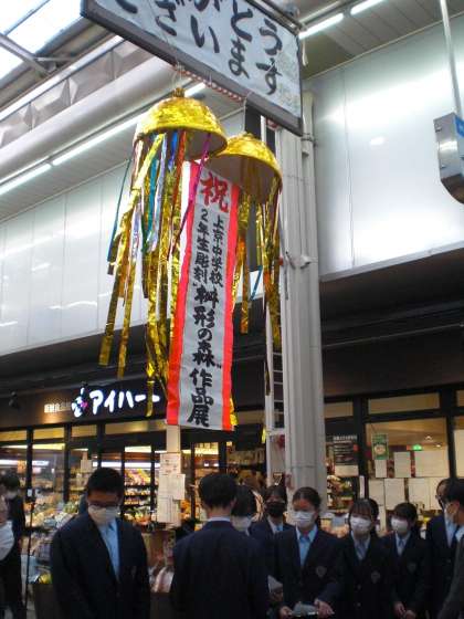 くす玉の垂れ幕には「上京中学校2年生 CM制作・彫刻“桝形の森”作品展」と達筆な文字で書いていただき、参加者一同感激していました。