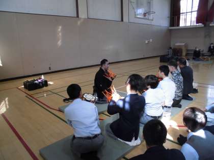 能楽協会から講師の先生方をお招きし、能に使用される四拍子 (笛・小鼓・大鼓・太鼓)の体験をしました。