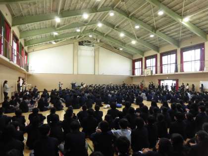 最初は、吹奏楽部の演奏をバックに入場、生徒会から歓迎の言葉がありました。2、3年生が校歌を合唱し、1年生に披露する場面もありました。