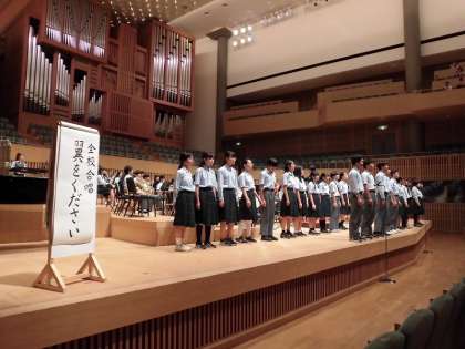 写真は、吹奏楽部の演奏のもと、全校合唱を行っている際の様子です。
