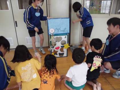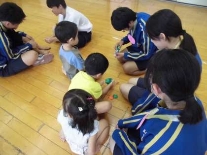グループに分かれて自己紹介から始まった時には、お互いに少し緊張もありましたが、生徒、園児のみなさん全員で体を動かして交流したり、生徒が手作りしたおもちゃでグループごとに遊んだりと、時間内めいっぱい楽しみながら交流することができ、最後はみんな笑顔で活動を終えることができました。
