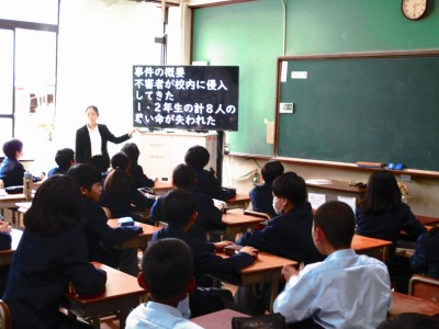 4月23日(水)6限目は避難訓練を行いました。今回の避難訓練は不審者対応の訓練でした。訓練前には、大阪教育大学付属池田小学校でおきた事件をもとに、不審者対応の大切さについて学習しました。その後の訓練では、不審者の侵入を防ぐ練習などを行い、体育館に避難しました。各クラスしっかりと身を守り避難することができました。今日の訓練で学んだことを忘れないようにしましょう!