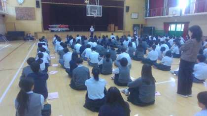 校長先生のお話では、明日からの修学旅行で3つのこと、「助け合い、学びあい、行動・表現」を実践するよう話されました。