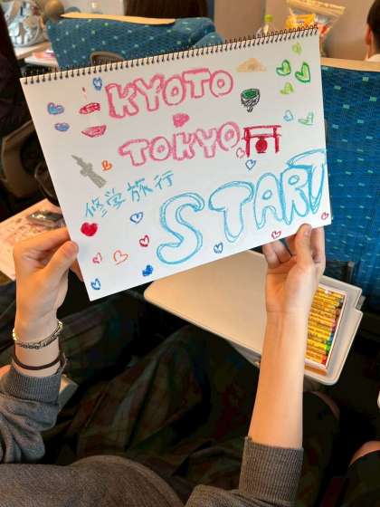 新幹線車内での様子です。カードゲームなどをして楽しく過ごしています。車内で早めの昼食をすませます。