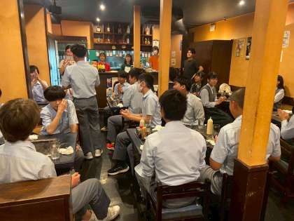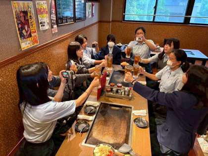 月島もんじゃストリートでは、もんじゃの作り方を学び、お茶で乾杯した後は、人数分の種類のもんじゃを堪能しました。