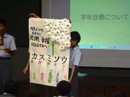 6月2日(月)6限目、2年生は学年集会を行いました。学年集会では学年目標の発表がありました。学年目標は「カスミソウ」です。カスミソウのように「感謝」「幸福」を言える学年へというメッセージが込められています。明日からはじまるチャレンジ体験でも「感謝」「幸福」を言えるといいですね。学年目標の発表後、チャレンジ体験に向けての最終確認がありました。このチャレンジ体験は、「働くとは?」というテーマで取り組んでいます。代表者が働くとは?何か発表してくれましたが、チャレンジ体験を通して「働くとは?」どんなことか少しでもわかるといいですね。4日間充実した活動になることを願っています。