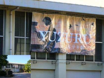 昨日(9月26日)、体育館横に3年学年劇『夕鶴』の巨大看板が設置されました。これは、176枚のA3用紙を組み合わせて大道具係が中心になって作製した。