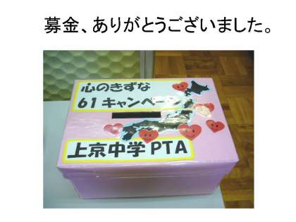 上京中学校で、ご支援いただいた14700円は、昨日(6月12日)送らせてもらいました。ご協力ありがとうございました。