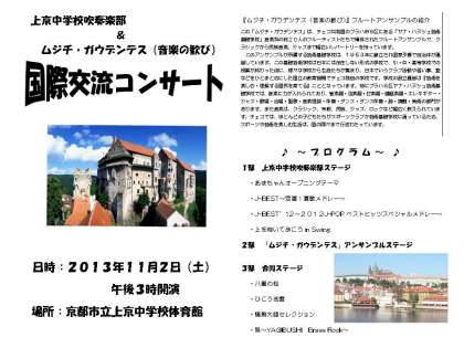 11月2日(土)午後3時から4時ころまで、上京中学校体育館で、国際交流コンサートを開催します。「上京中学校吹奏楽部」と「ムジチ・ガウデンテス」の素敵な演奏を聴いて、秋の午後を過ごされませんか?