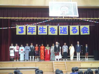 3月11日の5・6限に3年生を送る会がありました。世界の言葉でありがとう・おめでとうの生徒会の発表から始まりました。1年生は委員会や係ごとに写真を撮ったパラパラまんがになるメッセージと歌の贈り物を、2年生はミュージカルを通して明るく笑顔になれるようなエールを送りました。3年生からはメッセージと歌をもらい、本当に卒業されるのだと実感がわき、寂しい気持ちになりました。そして最後に、全校音楽で練習をした“歓喜の歌”を歌いました。練習とは違い、みんなで感動を共有することができました。3年生の皆さん、本当におめでとうございます!