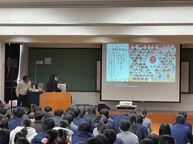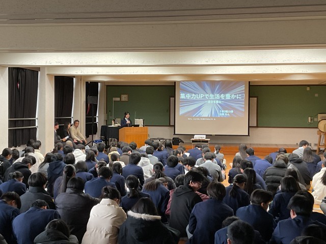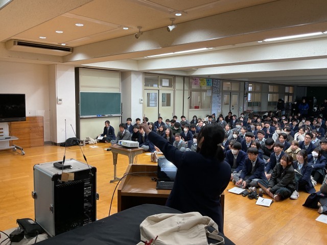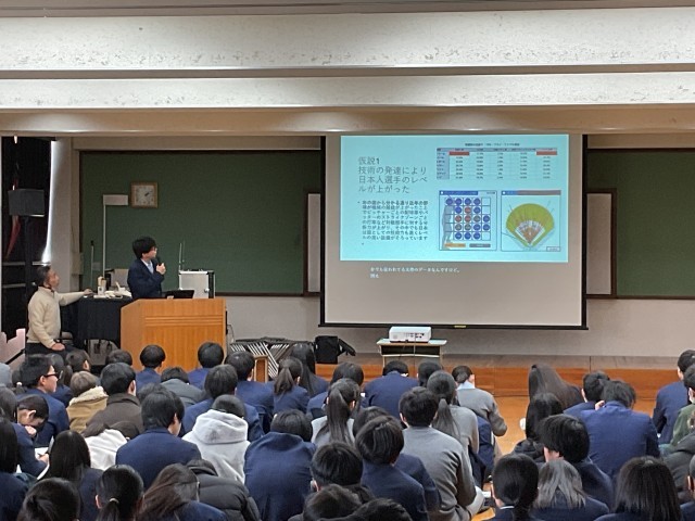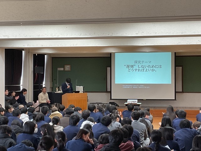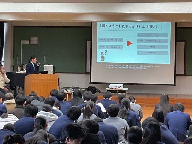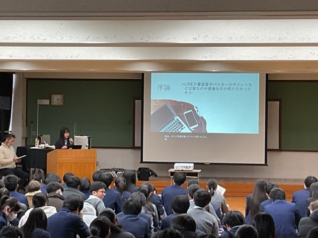 3年生は総合的な学習の時間、上京タイムで2学期から探究活動を行っています。探究活動とは、自身の関心事を課題の設定→情報の収集→整理・分析→まとめ・表現といった一連の活動で深く考えて筋道を通して明らかにしていく活動です。探究活動では「とことん Well-being!」を大テーマに、問いを持つことからスタートしました。考える一歩目は、「世の中の疑問に気付く」こと。あとはその中から、「①自分の力で答えに近づくことができて、」「②調べたら自分の願いが叶う」問いを選ぶという過程を踏んで2学期自身が設定した問いから結論を導くべく生徒たちは探究活動をしてきました。最初に4人グループで発表しグループ代表を決め、次はクラス内で各グループ代表が発表してクラス代表を決めました。1月23日(金)5,6限に多目的室で各クラス代表の発表を行いました。7人の発表者には「一歩上をいくプレゼン」を目指す10項目の視点からいくつか自分のプレゼンの改善につながりそうなものを選び、修正して当日に臨んでもらいました。7人の発表者は「自分の好き」を堂々と発表し、その「好き」の価値が十分に伝わり魅力を共感できた素敵な会となりました。発表後、立命館大学の川那部隆司先生からとても良かったという感想と言葉を大事に表現するという助言をいただきました。終了後の振り返りでは「問いの重要性について気づく力がついたと思う。今まではなんだろうと思っていたものを追求することはなかったが、今回探究を進めて、これは面白い、これはどういうことだろうなどと調べたり分析したりしているうちに、どんどん広げたり深めたりする力が身についていったと思いました。」「自分の主張を客観的にみて考えたり、より一つのことに対して説得力のあるものになるような構成を少しずつ考えられるようになった。修学旅行での探究よりもレベルアップしたものを作れるようになったと感じている。しかし、川那部先生も言っていたように、最初に設定した問いから探究しているうちに違う方向にずれていったり、言葉のつながりといったものにまだまだ課題を感じたので、高校の探究ではその点を意識したいと思った。」など良い学びにつながったという意見がたくさんありました。後者の生徒が言うように高等学校での探究はさらに自分自身の成長につながる学びを実現してほしいと思います。