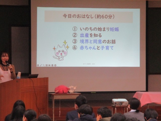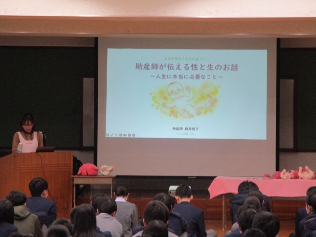 3月2日(月)3・4限目に2年生は性教育学活を行いました。2年生のテーマは「自己の性と生命の尊さを理解し、自他の価値を尊重しながら主体的に行動できるようになるには?」というテーマで、助産師の綾井先生を講師としてお招きしました。助産師として「いのちと日々向き合う」仕事をする中で感じる「命の奇跡」の話や「出産の奇跡」の話、そして人間関係を築くために必要な「人との境界線」の大切さなど様々なお話をしていただきました。4時間目には赤ちゃんとその母親に来校していただき、育児から学ぶことや乳児の日々成長する姿について話していただきました。「自分がうまれてきたことは素晴らしいこと。だからこそ毎日を大切に生きていってほしい」という綾井先生の思いを忘れずに毎日を過ごしていけたらいいですね。