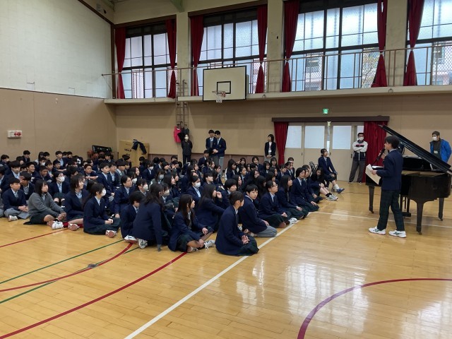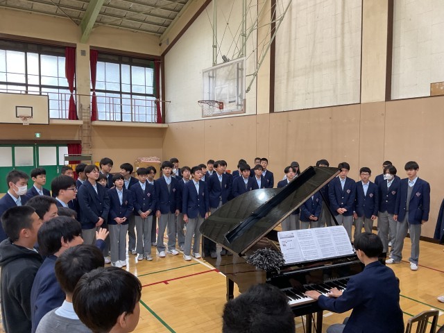 4限目には、本日5限目に実施される新入生歓迎会に向けた練習を行いました。2年生のときの後期の評議員が中心となり、その場で考え、指示を出しながら活動を進め、校歌の練習や劇「となりのトトロ」の内容説明、合唱練習、通し練習までを、生徒たちの力だけでやり遂げました。