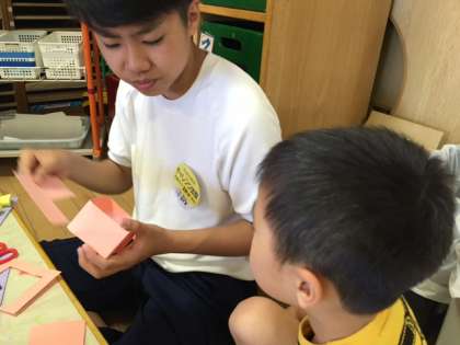 みつば幼稚園では、全力で鬼ごっこ、画用紙で工作をしています。