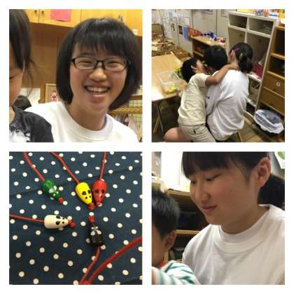 楽只保育所では飛行機を作ったり、ねずみとりをしていました。園児たちの名前も覚え、慣れたようすです。今日は一緒に給食を食べるみたいです!