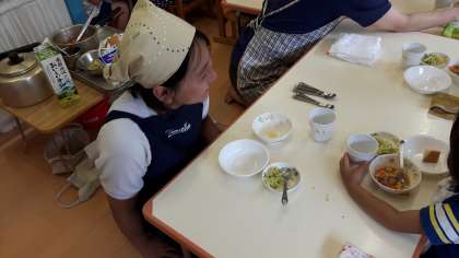 園児たちと一緒にお昼ご飯を食べているところです。