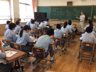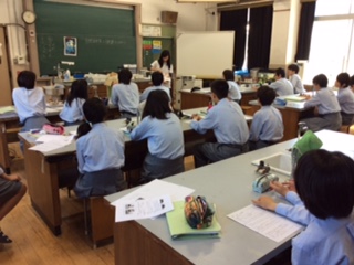 2年生の様子です。2組は理科で、自然研究の課題を探しています。3組は数学で、連立方程式の解き方の一つ、加減法を勉強中。4組は社会で、九州地方の工業の発展について学習しています。