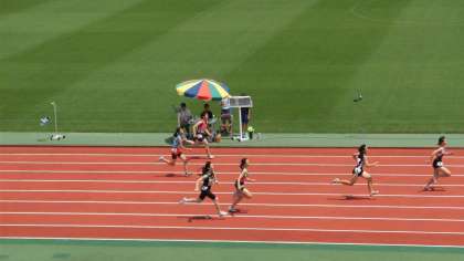 写真上:3年Tさんの100m走(真ん中の5コース)