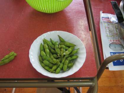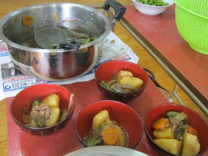 1組では育てたジャガイモと、ししとう、枝豆を調理しました。おいしそうですね。おいしくいただいています!