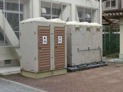右の写真 ・・・・北校舎南側(プール側)に設置された仮設トイレ