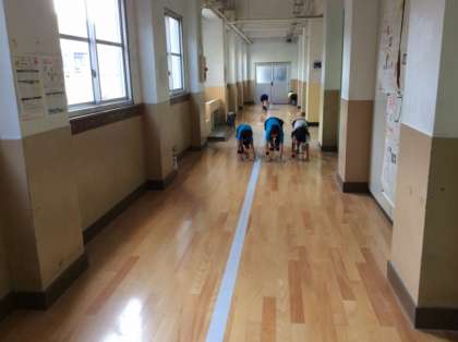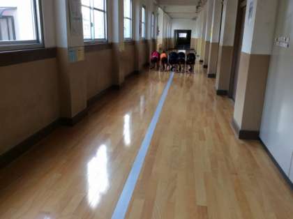 夏休みが終わり、明日から快適に学校生活を送れるよう、工事で汚れた全フロアを拭き掃除してます。