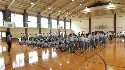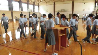 写真下:司会の演台を運んでくれる2年生女子2名です。