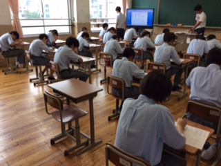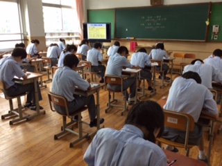 2年生、朝読書の後は、全員で、学年フロアを1時間かかけて雑巾掛けしました。綺麗になった教室で、その後、4教科のテストが行われました。