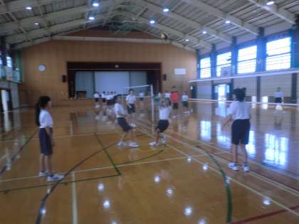 女子は体育館でバレーボール、男子は運動場の砂場で幅跳びを行っています。