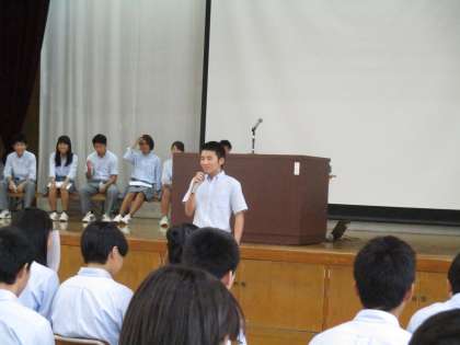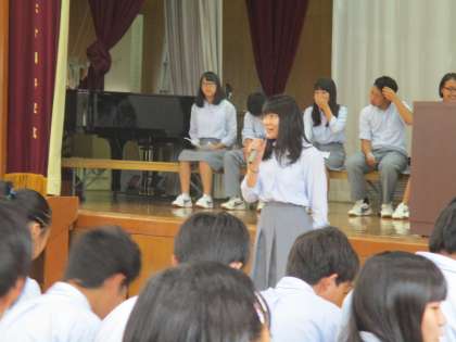 わたしの主張の学年発表が行われました。各クラス代表2名、1組からは1名が発表しました。学習協力委員が進行を行ってくれています。