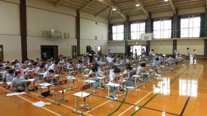 写真中:検定を待つ生徒は自席でプリント学習中