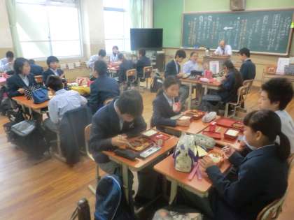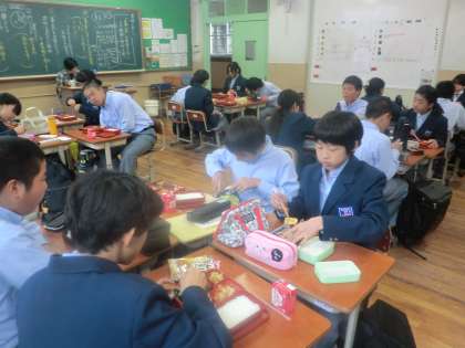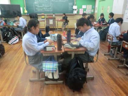 お昼の放送に耳を傾けながら、班の仲間と楽しいお昼ご飯の時間を過ごしています。