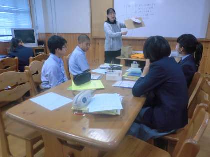 写真下:1−4家庭科・・・被服領域の授業を、いきいき交流ルームで行っていました。