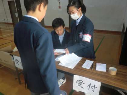生徒会選挙では、世の中での本物の投票で使われている投票箱などをお借りしてきて、会場も実際に近い設営をして行っています。