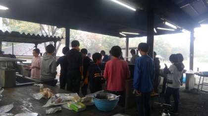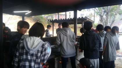 野外炊飯、始まっています。てんやわんやです。天気は、生徒たちのパワーに圧倒されてか、小雨になってきています。