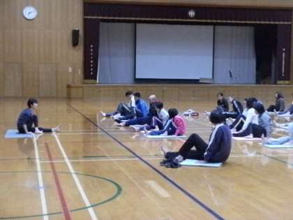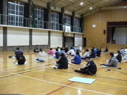 本日午後7時より、本校体育館において、PTA学級保体委員会行事「ヨガ教室」を開催しました。保護者・生徒の皆さん、教職員あわせて約30名が参加し、気持ちよく汗を流しました。ゆっくり、丁寧に指導していただき、大変リラックスした時間を過ごせたと思います。ただ普段、運動不足ぎみの皆さんにとっては、少しきつかったかも・・。