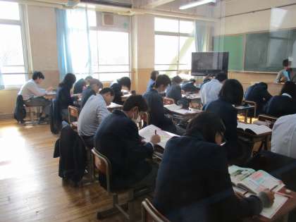 3年生授業の様子です。体育ではテニスをやっています。外はぽかぽか陽気ですが、室内は肌寒いです。体調に気を付けてテストに向けてがんばりましょう。