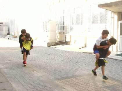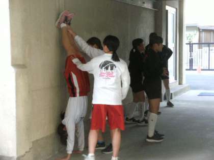 バレーボール部、バスケットボール部は外練で、グランドでのジョギングのあと、倒立やおんぶダッシュで鍛えています。