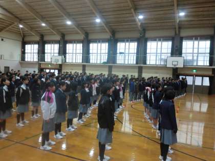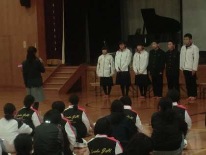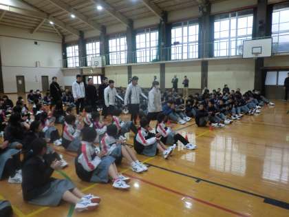 全校生徒で歓迎のセレモニーを行った様子です。