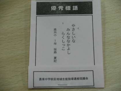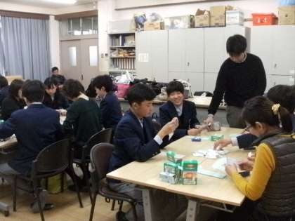 おいしく昼食をいただいたあと、いよいよ人権標語ミニリーフレットづくりです。各校から選ばれた人権標語を書いた紙に、絆創膏を2つずつはさんで、ミニリーフレットにしていきます。