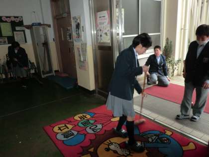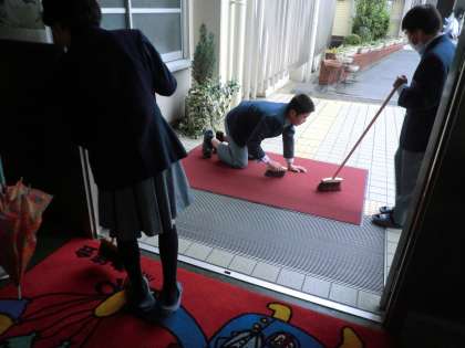 掃除当番の生徒に「いつも本当によくがんばってくれますね。」と、声をかけると、「はいっ、やりがいがあるから!」と即答で返ってきました。気持ちのこもった言葉が、とてもうれしく感じました。ひざまづいて足拭きマットをきれいにしてくれる姿にも感動しました。「ありがとう」