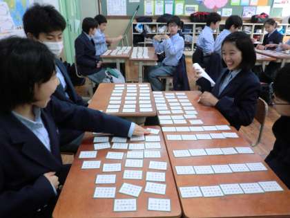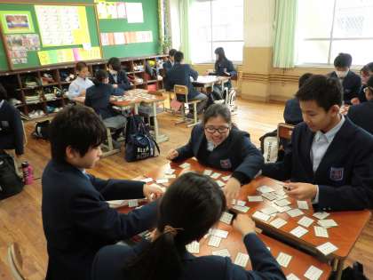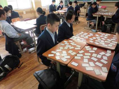 今日の学活では、各クラスでカルタ取りをしました。