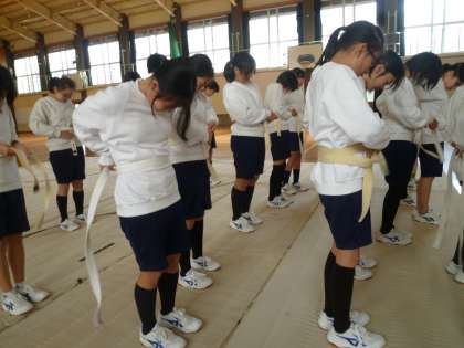 女子は体育館で柔道の帯の締める練習から行っていました。
