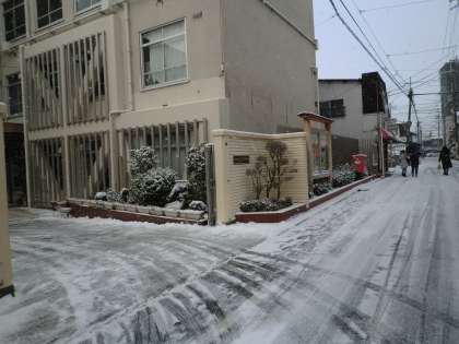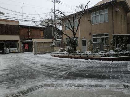 今朝の嘉楽中学校は、真っ白な雪景色。