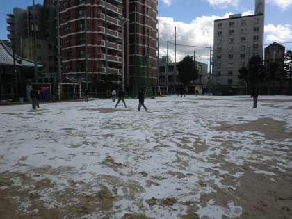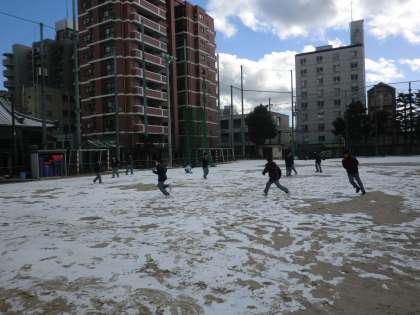 グランドで雪あそび。元気いっぱいです。