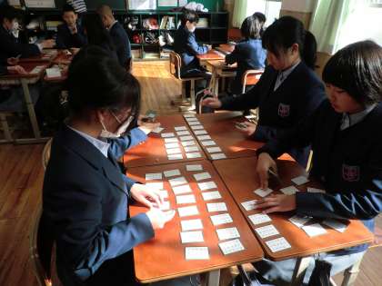 1年生の5・6時間目の学活では、待ちに待った「百人一首大会」が開かれました。