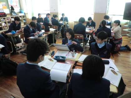 1年3組:国語「罪を問う」もしくは「弁護する」ための根拠を本文から探す(写真中)